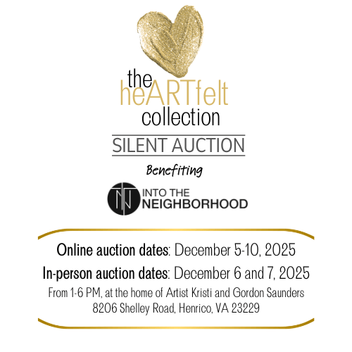 A friend of ours, Kristi, invited us to join in her 3rd Annual Holiday Sale, featuring 8 amazing artisans! She invited us to set up a table and share about the work we do, and offer an option to gift buying by making a donation in the honor of the gift receiver. Of course, we said YES! Then, one thing led to another. While these amazing artisans will be selling their creations on her first floor, Into The Neighborhood will be in her studio. We will host ~the heARTfelt collection~ a silent auction benefiting our vision of creating community through Mardi Bras doing life with the recovery community of Metro Richmond as they create a new life of freedom from substance use disorder (aka addiction), and other initiatives.